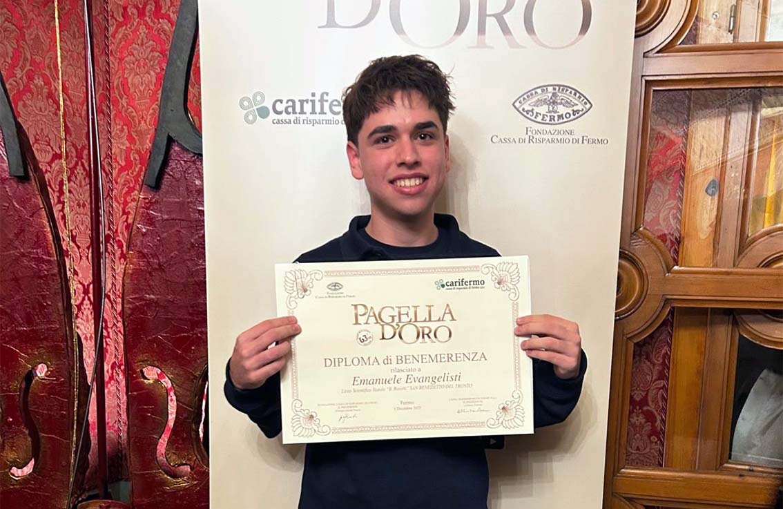 SAN BENEDETTO DEL TRONTO – Emanuele Evangelisti è lo studente del Liceo Scientifico “B.Rosetti” di San Benedetto del Tronto che ha conseguito la Pagella d’Oro 2025. Il prestigioso riconoscimento è assegnato annualmente dalla Carifermo S.p.a., con il contributo della Fondazione Cassa di Risparmio di Fermo, agli studenti segnalati come migliori da tutte le Scuole Secondarie di Primo e Secondo Grado con sede nei Comuni delle Province di Fermo, Ascoli Piceno, Macerata, Ancona e Teramo, dove la Carifermo Spa è presente con sue Filiali. La cerimonia di premiazione della 63^ edizione della Pagella d’Oro si è svolta lunedì 1 dicembre 2025 presso il Teatro dell’Aquila di Fermo, con un intervento di Matteo Piano, pallavolista nazionale italiana, intitolato “Forti con le proprie fragilità”. Per il Rosetti, il premio è andato a Emanuele Evangelisti, attualmente frequentante la classe IV A, “i cui brillanti risultati riempiono d’orgoglio tutta la comunità del nostro istituto – ha commentato la Dirigente Scolastica Elisa Vita -. Studenti come Emanuele rappresentano uno stimolo per gli altri e lasciano un segno”. «Sentirsi premiati e vedere riconosciuti tutti gli sforzi fatti è forse la vittoria più grande. – afferma Emanuele Evangelisti – È una spinta per continuare a dare il meglio, sempre con il sorriso. Aver vissuto questa esperienza con così tanti ragazzi ed essermi confrontato con persone diverse che condividono la mia stessa curiosità e il mio stesso desiderio di conoscere è qualcosa che mi arricchisce profondamente. Anche l’incontro con Matteo Piano, cui ho avuto il privilegio di porre una domanda relativa all’emotività nelle prestazioni e a come gestirla, ha rappresentato un importante momento di riflessione. Dedico questo traguardo a me, alla mia famiglia e alla scuola che ogni giorno mi offre l’opportunità di crescere».