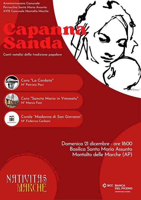 MONTALTO DELLE MARCHE – Capanna Sanda, potrebbe sembrare un errore grammaticale, invece è la storpiatura dialettale di una frase del canto popolare natalizio marchigiano più conosciuto “Natu natu Nazzarè”, recuperato dall’etnomusicologo maceratese Giovanni Ginobili nelle campagne di San Severino Marche e armonizzato per il celebre Coro della Sat di Trento da Lino Liviabella negli anni ‘50. Il messaggio spontaneo del popolo settempedano è riassunto appunto con le semplici parole: «Capanna Sanda, ndo’ che che ci stà Gisù se sona e canda». Come dire dove c’è Gesù c’è gioia e voglia di vivere. Il Coro “La Cordata” di Montalto Marche e il Coro “Sancta Maria in Viminatu di Patrignone, nell’organizzare la 21a edizione di Canti Natalizi della Tradizione Popolare, hanno scelto questo passo, come suggestivo e immediato titolo della manifestazione, inserita nella più ampia ottica del “Nativitas Marche”, un calendario regionale di eventi corali legati al Natale, curato dall’Arcom (Associazione Regionale Cori Marchigiani), in collaborazione con vari enti locali, in questo caso l’Amministrazione Comunale, la Parrocchia Santa Maria Assunta e l’Avis. Nella Cripta della Cattedrale Santa Maria Assunta di Montalto Marche, dove è possibile visitare un artistico presepe permanente, domenica 21 dicembre alle ore 18, si esibiranno i seguenti cori: Coro “La Cordata” – Montalto Marche (AP) diretto dal M° Patrizio Paci; Coro “Sancta Maria in Viminatu” – Patrignone (AP) diretta dal M° Marco Fazi; Corale “Madonna San Giovanni” – Ripatransone (AP) diretta dal M° Federico Carboni.