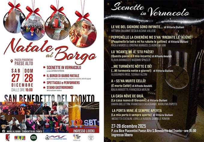 SAN BENEDETTO DEL TRONTO – Anche quest’anno il Comune di San Benedetto del Tronto, in collaborazione con l’Associazione Arte Viva, organizza “Natale al Borgo”, un evento che rinverdisce le tradizioni popolari e che da molti anni anima il Paese Alto della città durante le feste natalizie. Per l’edizione 2025, che si svolgerà sabato 27 e domenica 28 dicembre dalle 15.00 alle 20.00,  saranno riproposte le scene in vernacolo sambenedettese a cura dell’Associazione Teatrale “Ribalta Picena”, secondo una formula differente rispetto al passato perché lo spettacolo non sarà itinerante, ma concentrato all’interno di Piazza Bice Piacentini, dove saranno allestiti stand gastronomici con vin brulè, dolci della tradizione, olive e aperitivi, curati dal Comitato Festeggiamenti San Benedetto Martire e dalla ditta Quattropallette. Saranno rappresentate sette scenette tratte da racconti popolari e dalla migliore letteratura dialettale, composte da Vittoria Giuliani, dall’indimenticato regista Alfredo Amabili e da Piero Di Salvatore, che vedranno impegnati una ventina di “attori” amatoriali con l’intento di preservare e valorizzare il nostro vernacolo così originale, vivace e ricco di sonorità. All’interno della stessa piazza sarà allestito anche il “Borgo di Babbo Natale”, un ricco contenitore di giochi, animazioni, performance di artisti di strada e tanto altro che affiancherà, alternandosi, il repertorio delle scenette. L’ingresso è libero e non sarà contingentato, in modo tale che il pubblico potrà accedere liberamente ed assistere allo spettacolo che sarà riproposto più volte nel corso del pomeriggio. Per ulteriori info: pagina Facebook “Natale al Borgo – San Benedetto del Tronto” – artevivaassociazione@gmail.com