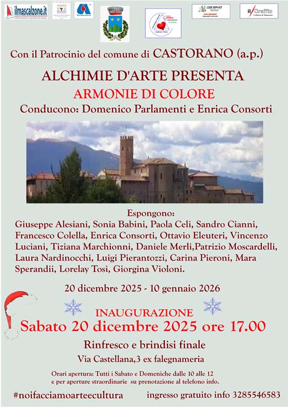 CASTORANO – Alchimie d’Arte conclude il calendario espositivo del 2025 con un evento di particolare rilievo che, con il Patrocinio del Comune di Castorano, presenta la mostra d’arte “Armonie di colore”, un percorso espositivo dedicato ai grandi maestri della pittura e della scultura contemporanea. L’inaugurazione si terrà sabato 20 dicembre 2025 alle ore 17.00 presso le sale espositive di Via Castellana, 3 – Castorano. La serata inaugurale sarà condotta da Domenico Parlamenti, Presidente di Alchimie d’Arte, ed Enrica Consorti, Responsabile artistica dell’associazione. In mostra le opere di Giuseppe Alesiani, Sonia Babini, Paola Celi, Sandro Cianni, Francesco Colella, Enrica Consorti, Ottavio Eleuteri, Vincenzo Luciani, Tiziana Marchionni, Daniele Merli, Patrizio Moscardelli, Laura Nardinocchi, Luigi Pierantozzi, Carina Pieroni, Mara Sperandii, Lorelay Tosi, Giorgina Violoni. L’iniziativa si avvale della preziosa collaborazione di Avis Monteprandone e Auser Insieme Monteprandone, con il sostegno degli sponsor Farmacia S. Giacomo di Fabrizio Roncarolo e Code Service di Lino Damiani. La mostra sarà aperta al pubblico tutti i sabati e le domeniche fino al 10 gennaio 2026, con orario 10.00 – 12.00. È possibile richiedere aperture straordinarie contattando il numero 328 5546583. L’ingresso è libero. Info: 328 5546583.