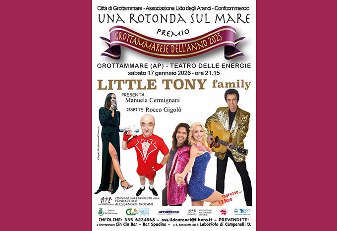 GROTTAMMARE – È quasi tutto pronto per l’evento di inizio anno, che darà il via a un calendario fittissimo della Pro Loco di Grottammare Lido degli Aranci, “Una Rotonda sul Mare – Premio Grottammarese dell’anno” che si svolgerà sabato 17 gennaio alle ore 21,15 al Teatro delle Energie. Infatti è stato già definito il cast della manifestazione condotta dalla giornalista televisiva Manuela Cermignani, che come di prassi vede sempre un vincente connubio tra cabaret e musica. Primo ospite direttamente da Zelig Rocco Ciarmoli, il Gigolò più famoso d’Italia, che al grido di “Donne, donne, è arrivato Rocco!” ed altri sketches intramezzerà la serata. Ospite d’onore la figlia dell’indimenticato Little Tony, Cristiana Ciacci, che con il cantante, storico collaboratore del padre, Angelo Petruccetti, daranno vita al concerto della “Little Tony Family” che canterà tutti i successi del cantante romano arricchiti da video e aneddoti interessanti e dalle stupende coreografie delle loro ballerine. Per la parte istituzionale, ovvero il Premio Grottammarese dell’anno 2025, già nella cittadina rivierasca è partito il toto-vincitore, che sarà svelato solo alcuni giorni prima dell’evento. Come di consueto ormai, al vincitore sarà donata un’opera di un artista grottammarese e anche tutto questo sarà svelato all’ormai prossima conferenza stampa. La serata da sempre unisce lo spettacolo alla solidarietà: infatti l’evento è a favore dell’Ail di Ascoli Piceno. Ultima chicca, ma sempre importante, il Premio E207, che vedrà premiato il bimbo nato a Grottammare, Samuel, che sarà omaggiato di un’opera anch’essa fatta da un’artista grottammarese e premiato, insieme a mamma e papà da tutte le autorità istituzionali e dalla Pro Loco. Organizzazione Pro Loco Lido degli Aranci, Confcommercio e Amministrazione Comunale di Grottammare. Ingresso unico di 12 euro, posti riservati. Infoline:335.6234568 e su tutti i canali social ufficiali.