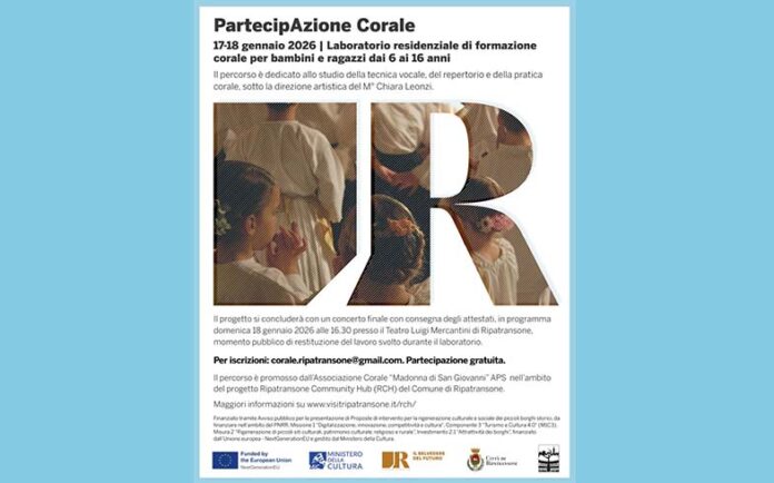 RIPATRANSONE – L’Associazione Corale Madonna di San Giovanni Aps promuove nei giorni 17 e 18 gennaio “Partecip-Azione Corale”, un laboratorio residenziale di formazione corale dedicato a bambine, bambini, ragazze e ragazzi dai 6 ai 16 anni. L’iniziativa propone un percorso intensivo di studio e pratica del canto corale, con particolare attenzione alla fisiologia vocale, alla didattica per fasce d’età e al lavoro d’insieme. Il laboratorio è rivolto sia a chi desidera avvicinarsi per la prima volta al canto corale, sia a chi intende approfondire un percorso già avviato. La direzione artistica del corso è affidata al M°Chiara Leonzi. Il programma formativo affronta i principali aspetti della pratica corale, tra cui tecnica dell’emissione vocale, studio del repertorio, metodologia e didattica corale, coro scenico e lettura ritmica con fonemi. A ciascun partecipante sarà fornito un fascicolo con gli spartiti utilizzati durante il laboratorio. Le attività si svolgeranno tra la Scuola Primaria, la Biblioteca Gabrielli e il Teatro Luigi Mercantini, in base ad un calendario differenziato per fasce d’età. Il percorso si concluderà con una restituzione finale sotto forma di concerto, aperta al pubblico, che si terrà domenica 18 gennaio alle ore 16.30 presso il Teatro Mercantini, con consegna degli attestati di partecipazione.