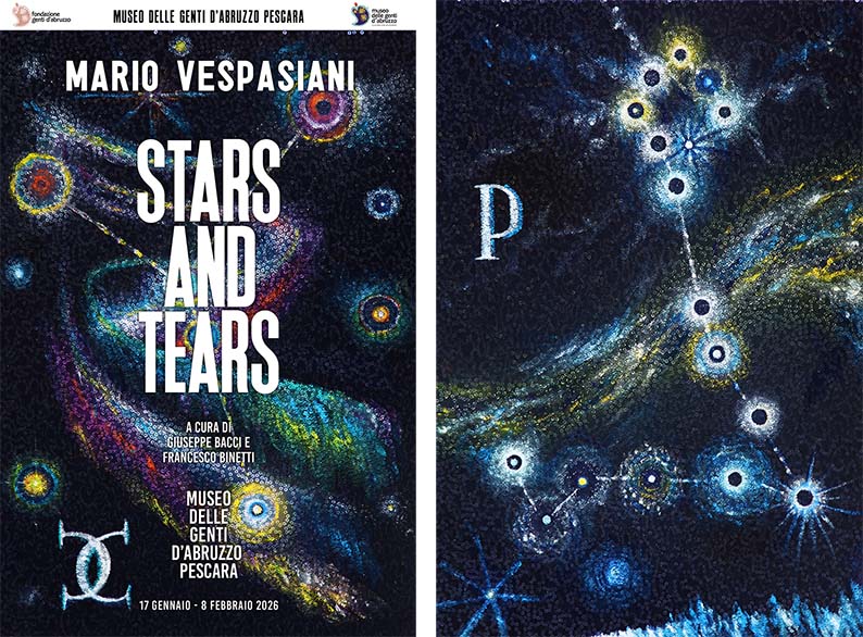 La mostra, dunque, propone una concezione della vita come processo continuo di trasformazione energetica e simbolica. In questo senso, la fine viene ricollocata all’interno di un ordine più ampio, che può essere letto come cosmico, spirituale o divino. Le stelle, distanti e silenziose, diventano testimoni di questa continuità: esistono da prima di noi e continueranno dopo di noi, eppure parlano intimamente alla nostra condizione. È proprio in tale capacità di tenere insieme opposti apparenti – scienza e fede, materia e spirito, finitudine e infinito – che “Stars and Tears” trova la sua efficacia filosofica. L’arte di Vespasiani apre uno spazio di contemplazione in cui il pensiero può sostare senza urgenza di risolvere. La mostra che si tiene proprio nel Museo delle Genti d’Abruzzo di Pescara è significativa in quanto è stato l’ultimo luogo dove il padre la scorsa estate ha visto le opere di Mario inserite nella mostra collettiva “L’arte italiana tra figurazione e astrazione”, fatto che invita a proseguire con lo stesso entusiasmo e a considerare che neanche tale soglia può interrompere la generazione della bellezza. In ultima istanza, “Stars and Tears” riafferma una caratteristica dell’arte di Mario Vespasiani: la sua qualità risiede nella capacità di trasformare un fatto profondamente personale in un’esperienza universale, che non appartiene più soltanto a chi l’ha creata, ma diventa luogo di riflessione per tutti. È in questo passaggio – dall’intimo al cosmico, dal singolare all’universale – che l’arte si fa davvero necessaria, così come ogni vita ben spesa continua ad illuminare.