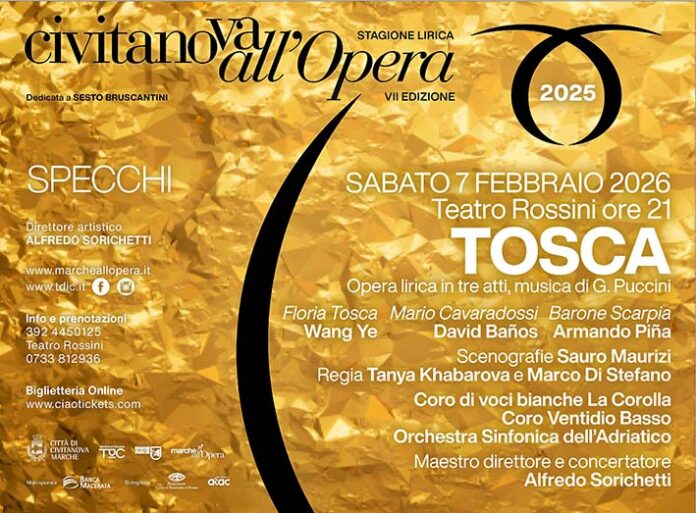CIVITANOVA MARCHE – Sabato 7 febbraio, alle ore 21, il Teatro Rossini di Civitanova Marche ospiterà una nuova e originale versione della Tosca, uno dei capolavori più amati di Giacomo Puccini. Opera lirica in tre atti che vedrà sul podio il maestro direttore e concertatore Alfredo Sorichetti, mentre la regia porta una firma inedita per il mondo lirico, ovvero quella di Tanya Khabarova e Marco Di Stefano, al loro debutto nella regia operistica. In scena Wang Ye (Floria Tosca), David Banõs (Mario Cavaradossi), Armando Piña (Barone Scarpia), con le scenografie di Sauro Maurizi , Coro di voci bianche “La Corolla”, Coro Ventidio Basso, Orchestra Sinfonica dell’Adriatico. Un progetto che nasce dall’incontro di linguaggi diversi e da un percorso artistico trasversale: dal Teatro della Comunità al cinema, dal teatro gestuale alla lirica. Un dialogo fertile tra discipline che promette di restituire Tosca in una chiave nuova, rispettosa della tradizione ma capace di parlare al pubblico contemporaneo con forza e autenticità.