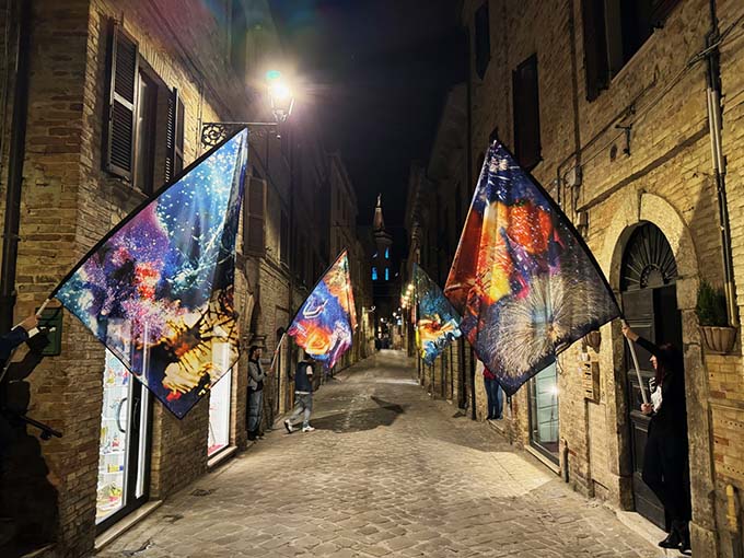 Non meno rilevante è l’aspetto rituale e simbolico dell’atto creativo: il Cavallo di Fuoco cinese è portatore di simboli astrologici legati agli elementi, alla fortuna e alla realizzazione dei desideri, mentre quello ripano, con la sua spettacolarità pirotecnica, può essere anche visto come momento in cui l’uomo innalza la propria e limitata luce verso il cielo notturno. In entrambe le tradizioni, il cavallo diventa agente di connessione: collega l’individuo alla comunità, il terrestre al celeste, il contingente all’eterno, dimostrando come archetipi condivisi possano assumere forme diverse pur mantenendo un messaggio comune di coraggio, gioia e rigenerazione. Infine, un elemento di profondità ulteriore si trova nella dimensione estetica e sensoriale: come l’anno del Cavallo di Fuoco cinese porta con sé colori e immaginazioni che stimolano l’intuizione e la creatività, invitando a nuovi inizi e sperimentazioni, a Ripatransone l’esperienza visiva e tattile della festa – il bagliore dei fuochi, la vibrazione dell’aria percorsa dalle scintille – mette in luce il patrimonio storico-culturale territoriale, il quale, se da sempre la identifica come Città d’Arte e Cultura, spero col mio lavoro di contribuire nel farla diventare Città d’Arte Contemporanea.