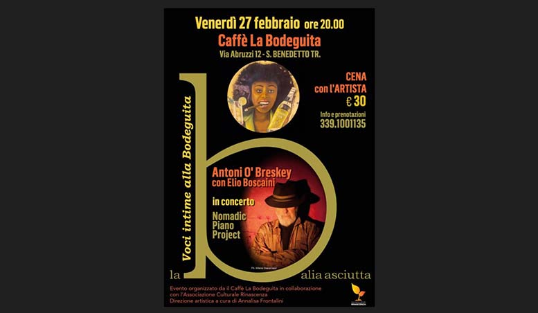 SAN BENEDETTO DEL TRONTO – Continuano gli incontri de “La Balia Asciutta – Voci intime alla Bodeguita”, la rassegna dedicata all’ascolto intimo e condiviso organizzata dal Caffè La Bodeguita (Viale Abruzzi, 12) in collaborazione con l’Associazione Culturale Rinascenza, con la direzione artistica di Annalisa Frontalini. Un progetto che nasce dal desiderio di ritrovare uno spazio raccolto e autentico, dove musica, poesia e letteratura possano scendere piano, come un gesto semplice e necessario. Un piccolo rifugio dalle luci morbide, in cui le parole trovano il tempo giusto per posarsi e creare vicinanza, nutrendo con l’arte chi ascolta. Il prossimo appuntamento è in programma venerdì 27 febbraio alle ore 20, negli spazi accoglienti del Caffè La Bodeguita, che per l’occasione si farà “balia affettuosa” di voci, storie e musica, offrendo un tempo sospeso di condivisione. La serata comincerà alle ore 20 con la cena e proseguirà con il concerto che inizierà intorno alle 21,15. Ospite della serata sarà il pianista, compositore e polistrumentista Antoni O’Breskey, accompagnato da Elio Boscaini alla chitarra flamenca, con il concerto “Nomadic Piano Project”: una musica senza confini né barriere, capace di creare un ponte suggestivo tra la tradizione classica occidentale, il jazz e le sonorità delle culture del mondo. Informazioni e prenotazioni: 339 1001135.
