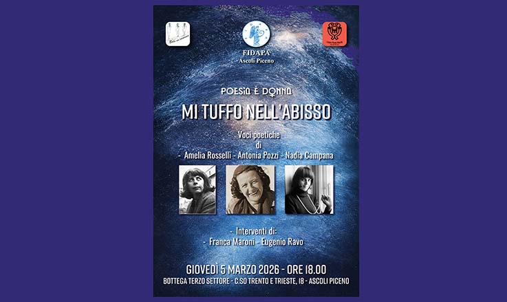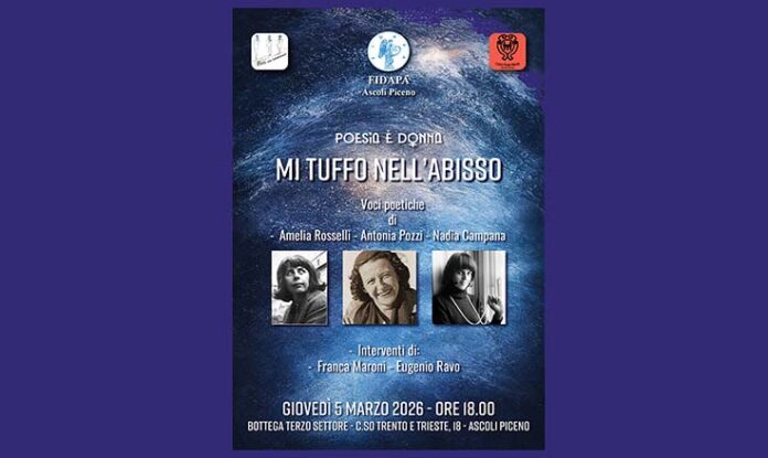 ASCOLI PICENO – Camminare nei primi giorni di marzo significa attraversare una soglia simbolica: quella della settimana dedicata alla donna. È un tempo di mimose e celebrazioni, ma anche di riflessione profonda sulle voci femminili che hanno saputo trasformare il dolore in parola, la fragilità in canto. Ed è proprio in questo clima che, giovedì 5 marzo alle ore 18, alla Bottega del Terzo Settore di Ascoli Piceno, si terrà l’incontro dal titolo evocativo “Poesia è donna. Mi tuffo nell’abisso”. L’iniziativa è promossa dalla Fidapa di Ascoli Piceno, con il contributo delle associazioni Centro Poesia Marche e Poeti in cammino, e si inserisce nel percorso culturale dedicato all’universo femminile, rendendo omaggio a tre poetesse dal verso intenso e fortemente toccante: Amelia Rosselli, Antonia Pozzi e Nadia Campana.