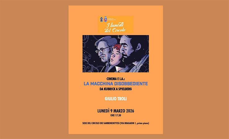 SAN BENEDETTO DEL TRONTO – “Cinema e Intelligenza artificiale: la macchina disobbediente. Da Kubrick a Spielberg” è il titolo della conferenza di Giulio Troli che si terrà lunedì 9 marzo ore 17.30 nella sede del Circolo dei Sambenedettesi (via Bragadin 1, Mercato Ittico lato sud, primo piano) per la serie dei Lunedì del Circolo. L’incontro affronta il tema dell’intelligenza artificiale attraverso alcuni film che hanno affrontato l’argomento in tempi molto precedenti a quelli dell’avvento definitivo di una questione che solo ha piena attenzione nel dibattito culturale. Lo sceneggiatore Giulio Troli converserà con il pubblico su un tema di stretta attualità ripercorrendo la storia del rapporto che il cinema e i suoi grandi autori hanno avuto fin dagli anni ’60 con le tematiche oggi sintetizzate nel dilemma del rapporto uomo/macchina ovvero IA e limiti umani.