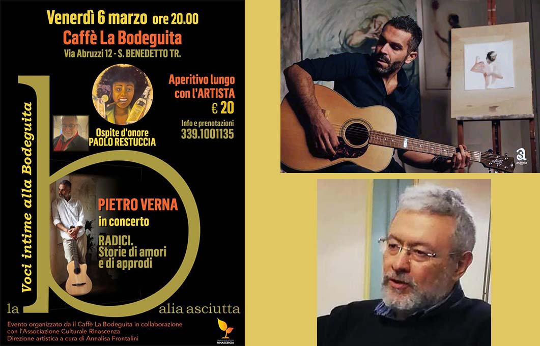 SAN BENEDETTO DEL TRONTO – Proseguono gli incontri de “La Balia Asciutta – Voci intime alla Bodeguita”, la rassegna dedicata all’ascolto intimo e condiviso organizzata dal Caffè La Bodeguita (Viale Abruzzi, 12) in collaborazione con l’Associazione Culturale Rinascenza, con la direzione artistica di Annalisa Frontalini. Un progetto che nasce dal desiderio di ritrovare uno spazio raccolto e autentico, dove musica, poesia e letteratura possano scendere piano, come un gesto semplice e necessario. Un piccolo rifugio dalle luci morbide, in cui le parole trovano il tempo giusto per posarsi e creare vicinanza, nutrendo con l’arte chi ascolta. Il prossimo appuntamento è in programma venerdì 6 marzo alle ore 20, negli spazi accoglienti del Caffè La Bodeguita, che per l’occasione si farà “balia affettuosa” di voci, storie e musica, offrendo un tempo sospeso di condivisione. Protagonista della serata sarà e l’educatore, cantautore e poeta Pietro Verna con il concerto “Radici. Storie di amori e di approdi”. Interverrà come ospite d’onore Paolo Restuccia, scrittore e editor, giornalista, autore e regista radiofonico, docente in corsi universitari. La serata comincerà alle ore 20 con la possibilità di fare un aperitivo lungo in compagnia degli ospiti al costo di 20 euro. Informazioni e prenotazioni: 339 1001135.