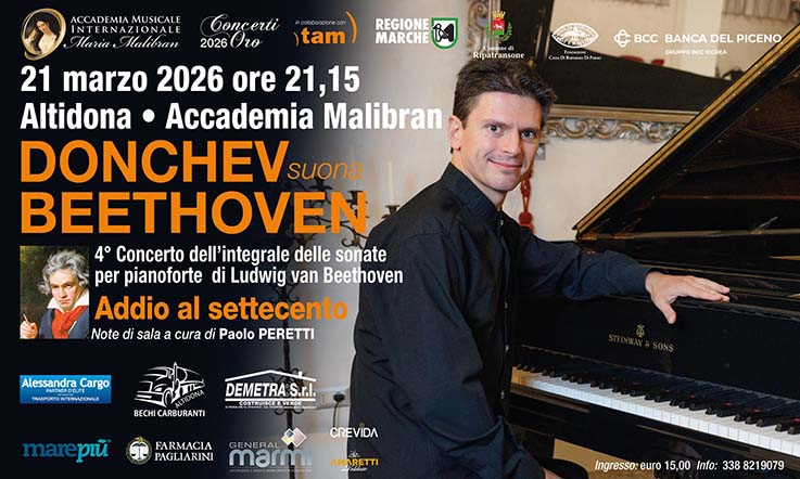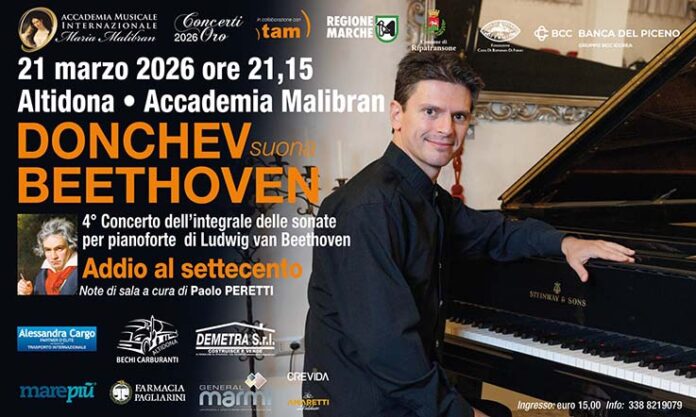 ALTIDONA – Sarà “Donchev suona Beethoven”, il 4° Concerto dell’integrale delle sonate per pianoforte di Ludwig van Beethoven, sabato 21 marzo alle ore 21.15 impreziosirà la Sala Colonna dell’Accademia Malibran di Altidona. Si tratta del quarto appuntamento del progetto “Donchev suona Beethoven”, ciclo dedicato all’esecuzione integrale delle 32 Sonate per pianoforte di Ludwig van Beethoven, un’impresa titanica, affrontata nella storia del pianoforte da pochissimi interpreti di spicco.