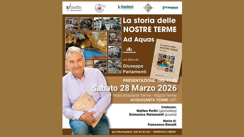 ACQUASANTA TERME – Ancora un evento storico organizzato da Alchimie d’Arte, sabato 28 marzo ore 17, all’Hotel Ristorante Terme di Acquasanta Terme, con protagonista Giuseppe Parlamenti e la sua ultima opera letteraria “La storia delle nostre Terme. Ad Aquas” (Cromo edizioni). L’evento sarà condotto da Domenico Parlamenti, Presidente di Alchimie d’Arte e dal giornalista Matteo Porfiri, con la partecipazione del giovane musicista Francesco Ranalli. La pregevole opera di Giuseppe Parlamenti tratta dell’argomento caro agli acquasantani, le tanto amate terme. L’incipit presenta frammenti di documenti storici autentici riportati alla luce dopo lunghe ricerche condotte dall’autore nelle biblioteche, negli archivi, nelle testimonianze di scrittori, dallo stesso archivio arricchito di documenti e immagini di Giuseppe Parlamenti, tracce storiche che prendono inizio dai tempi degli antichi romani, proseguendo con il Medioevo per arrivare ai nostri giorni.