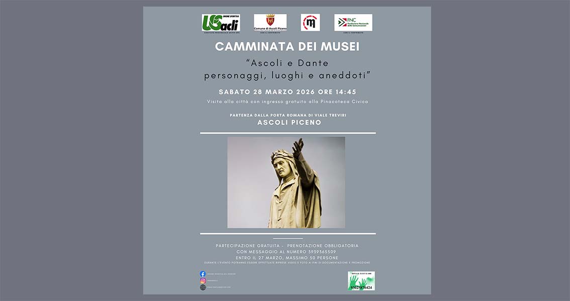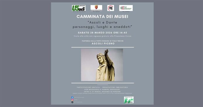 ASCOLI PICENO – Torna ad Ascoli Piceno il progetto “Camminata dei musei”, con un nuovo appuntamento gratuito promosso dall’Unione Sportiva Acli provinciale Aps, sostenuto dal Comune di Ascoli Piceno e dalla Fondazione Nazionale delle Comunicazioni, e realizzato in collaborazione con Ascoli Musei. Sabato 28 marzo, in prossimità del Dantedì, giornata nazionale dedicata a Dante Alighieri, è in programma un percorso cittadino alla scoperta del legame tra la città delle cento torri e il Sommo Poeta. In caso di maltempo, l’iniziativa si svolgerà attraverso un itinerario alternativo al coperto. L’evento, dal titolo “Ascoli e Dante: personaggi, luoghi e aneddoti”, prenderà il via alle ore 14.45 in viale Treviri, davanti alla Porta Romana. Da qui il gruppo si dirigerà verso la Pinacoteca Civica di Piazza Arringo, dove è previsto l’ingresso gratuito. Per partecipare è necessario prenotarsi inviando un messaggio al numero 3939365509, indicando nome e cognome dei partecipanti. Il numero massimo è fissato a 50 persone e le iscrizioni dovranno pervenire entro il 27 marzo. Il progetto “Camminata dei musei”, attivo dal 2015 nelle Marche e in Abruzzo, ha già registrato oltre 8.000 presenze in 165 eventi. Nella città di Ascoli Piceno sono stati organizzati più di 65 appuntamenti, che hanno coinvolto numerosi spazi culturali tra cui i Musei Civici (Pinacoteca, Museo della Ceramica, Museo Licini e Forte Malatesta), il Museo Archeologico, il Museo dell’Annunciazione, il Museo della Cartiera Papale, il Museo di Sant’Emidio, il Museo Diocesano, il Museo Pimu e il Museo Biblioteca Marcucci.