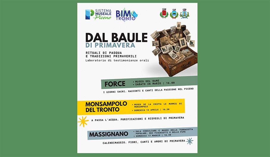 «“Dal Baule di Primavera” nasce dalla volontà di dare continuità al protocollo di intesa sottoscritto nel 2021 dal Bim Tronto e dal Sistema Museale Piceno con l’Istituto Centrale per il Patrimonio Culturale Immateriale (ICPI) del Ministero della Cultura.» dichiara Luigi Contisciani, presidente del Bim Tronto «Con questa iniziativa vogliamo che i giovani e i meno giovani si siedano allo stesso tavolo per riscoprire le proprie radici: un passaggio di testimone necessario affinché la nostra storia continui a vivere in chi verrà dopo di noi». Gli incontri, guidati dalla professoressa Gabriella Piccioni e animati da gruppi folkloristici locali, saranno, infatti, strutturati come momenti di dialogo intergenerazionale, canto, racconto e convivialità. Ognuno potrà diventare protagonista di questi incontri portando un oggetto, una lettera, un documento o anche un semplice ricordo dal proprio “baule” di famiglia e condividendo la sua storia e il suo significato.