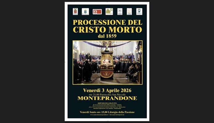 MONTEPRANDONE – La storica Processione del Cristo Morto della Parrocchia di San Nicolò di Bari di Monteprandone ha ottenuto un importante riconoscimento culturale e turistico: l’Associazione Borghi più belli d’Italia nelle Marche ha individuato nel territorio regionale cinque storiche e suggestive rievocazioni da non perdere nella giornata del Venerdì Santo. Tra queste insieme a Montecassiano, Sassoferrato, Marcello sul Metauro, Grottammare, c’è anche la storica Processione del Cristo Morto della Parrocchia San Nicolò di Monteprandone organizzata dalla Confraternita della Pietà e della Morte della medesima parrocchia. Quest’anno il programma prevede oggi, 3 aprile, alle ore 15 l’Adorazione della Croce presso la chiesa Parrocchiale di San Nicolò, seguita alle ore 21 dalla solenne Processione del Cristo Morto. Sarà disponibile anche il servizio gratuito di bus navetta con partenza alle ore 20.30 dal piazzale davanti al supermercato Eurospin di Centobuchi, mentre dalle ore 20,40 in poi, sempre con partenza dal piazzale antistante il Santuario Santa Maria delle Grazie, Monteprandone.