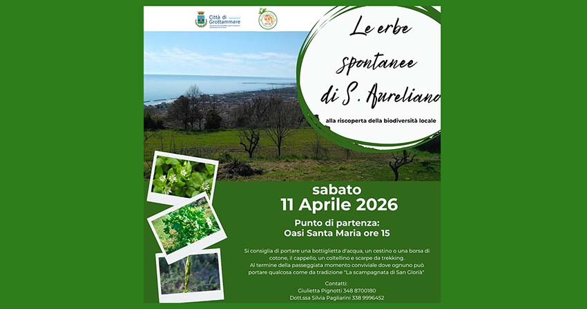 GROTTAMMARE – Nell’ambito delle attività dedicate alla sostenibilità e alla riscoperta della biodiversità locale, in sinergia con la dott.ssa Silvia Pagliarini e Giulietta Pignotti, sabato 11 aprile è in programma l’iniziativa “Le erbe spontanee di Sant’Aureliano”. Un’occasione per camminare insieme e imparare a riconoscere le ricchezze che la terra ci offre spontaneamente, guidati dall’esperienza e dalla passione di due professioniste del settore. L’evento è curato da Giulietta Pignotti e Silvia Pagliarini e grazie alla loro guida, verrà esplorato il sentiero verso e per Sant’Aureliano imparando a distinguere le specie botaniche, le loro proprietà e l’importanza della loro conservazione. L’iniziativa ha il patrocinio dell’Assessorato alla Sostenibilità. La partenza è fissata alle ore 15:00 con punto di ritrovo presso l’Oasi Santa Maria. L’obiettivo è sensibilizzare la cittadinanza sulla ricchezza del territorio e sull’importanza delle pratiche sostenibili. La partecipazione è gratuita.
