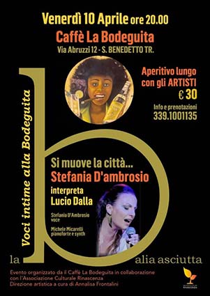 Stefania D’Ambrosio, in compagnia di Michele Micarelli, sarà la protagonista del concerto “Si muove la città…”, un omaggio intenso e raffinato a Lucio Dalla: venerdì 10 aprile, alle ore 20, negli spazi accoglienti del Caffè La Bodeguita –