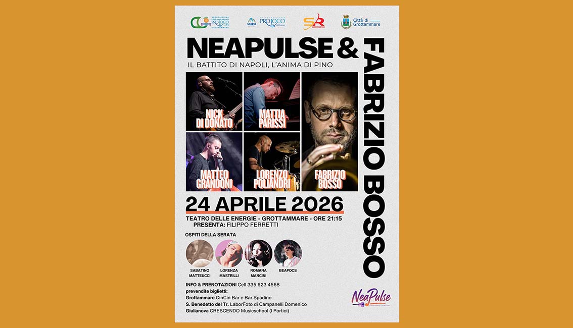GROTTAMMARE – Dopo il successo della stagione di “Commedie Nostre” – che vedrà la serata di Gala sabato 25 aprile con l’esibizione della Compagnia “Gli amici del teatro” di Loro Piceno e le attesissime premiazioni del Grottammare Mask 2026 con la presentazione straordinaria di Alessia Rivosecchi – da non perdere anche l’appuntamento musicale “Neapulse – Il battito di Napoli, l’anima di Pino” in programma venerdì 24 aprile al Teatro delle Energie di Grottammare. Un progetto nato da un’idea di Nick Di Donato e Stefano Romani. Uno spettacolo intenso e vibrante che celebra la musica e lo spirito di Pino Daniele, tra blues, jazz e radici partenopee, con video storici di Pino e dei suoi grandi amici-musicisti con cui ha collaborato nell’arco degli anni. Special Guest Fabrizio Bosso, trombettista tra i più apprezzati della scena jazz internazionale, capace di unire tecnica straordinaria, lirismo ed energia, con collaborazioni che spaziano dal jazz al pop d’autore. Sul palco un gruppo di grandi musicisti, uniti dalla passione e dal rispetto per una musica che continua a parlare al cuore: Nick Di Donato (voce e chitarre), Mattia Parissi (tastiere e synth), Matteo Grandoni (basso e contrabbasso), Lorenzo Poliandri (batteria). Una serata arricchita dalla partecipazione di tanti ospiti d’eccezione. Presentazione a cura di Filippo Ferretti. Una realizzazione SR Video Promotion e Pro Loco di Grottammare Associazione Lido degli Aranci, con il patrocinio della Città di Grottammare. Info e biglietteria: 335.6234568, prezzo biglietti numerati 12 euro. Come di consueto ormai per la realtà grottammarese si prevede un nuovo sold out, pertanto gli organizzatori invitano a prenotare gli ultimi posti disponibili per condividere l’esperienza di un viaggio musicale da vivere, non solo da ascoltare.